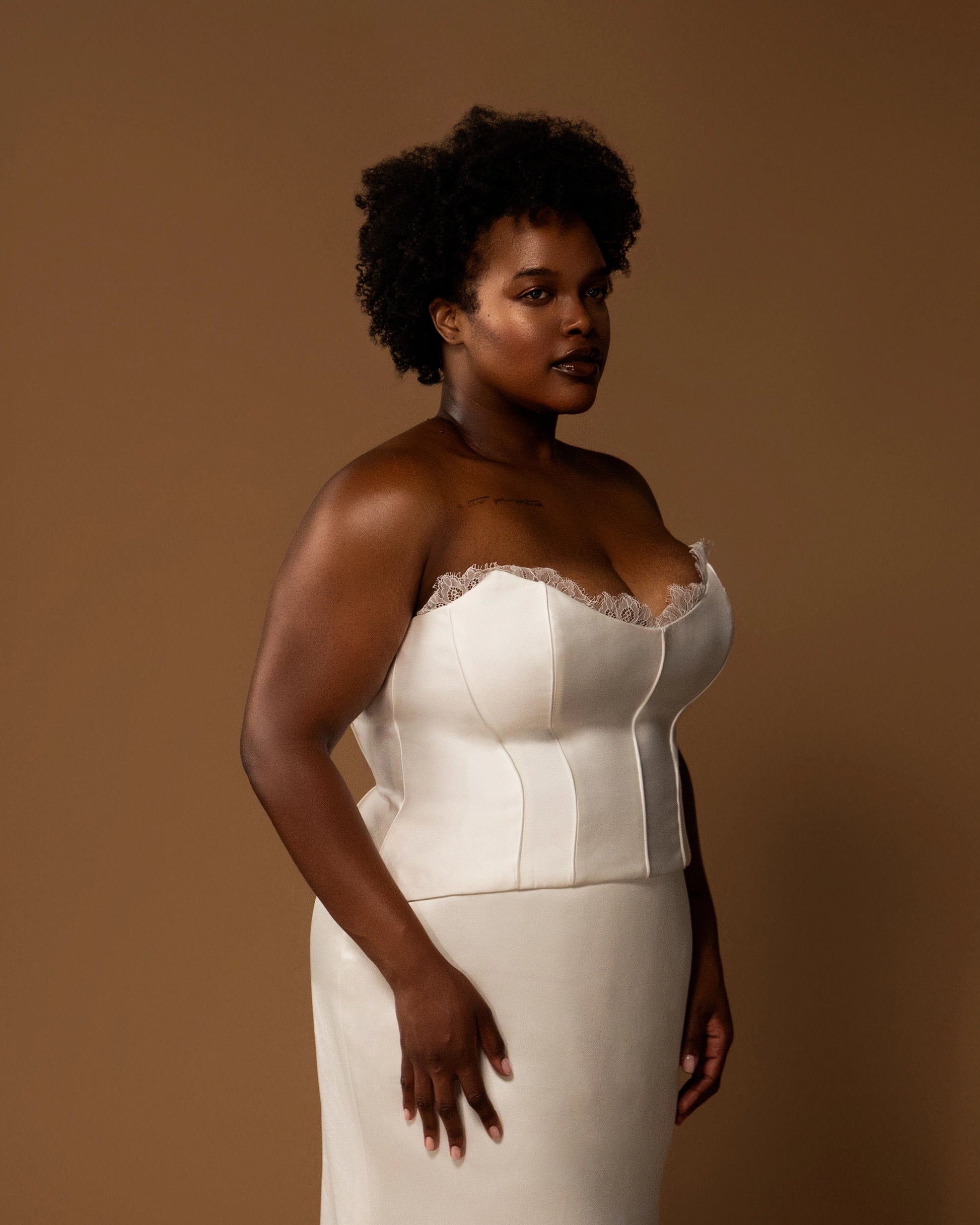 The Evangeline Corset offers a sleek, sculpted silhouette with luxe Mikado fabric, supportive boning, and vertical piping. A Chantilly lace peekaboo neckline adds softness, while a curved hemline elongates the legs and an invisible zipper creates a clean finish.