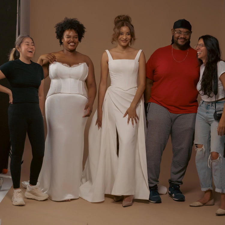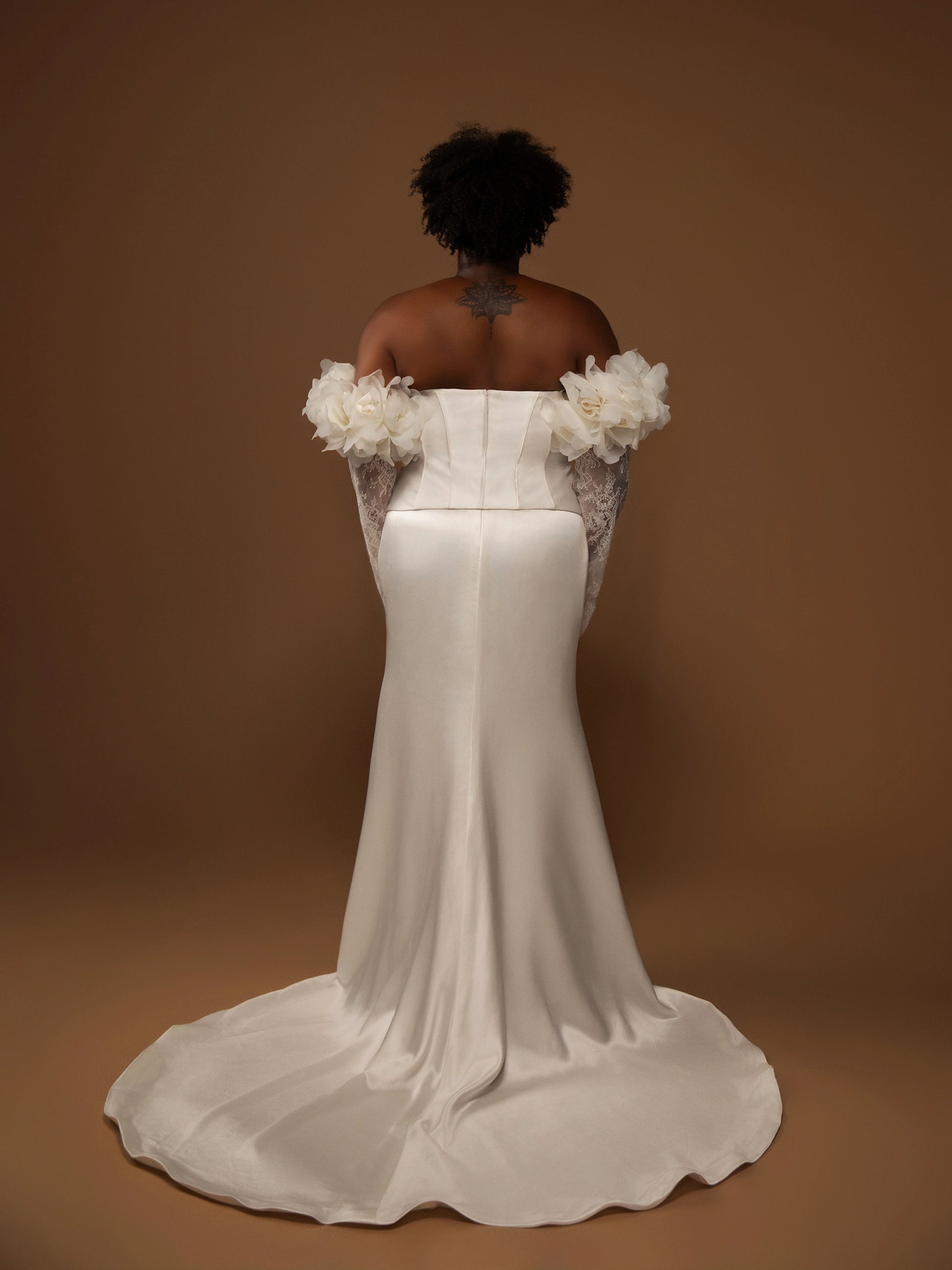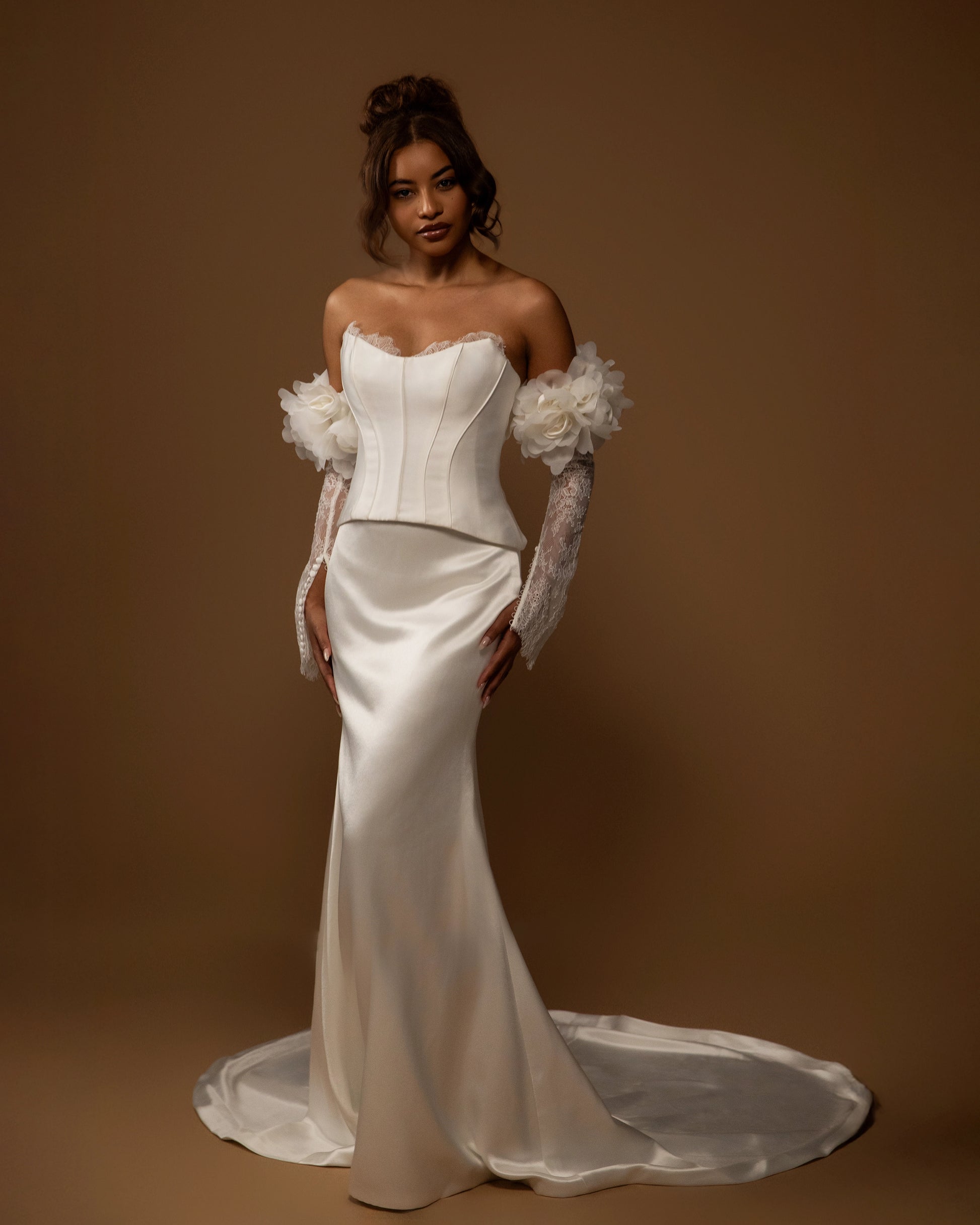 The Evangeline Look combines 3 standout pieces into one chic wedding-day look for the modern romantic. It features a contoured Mikado corset, a high-waisted satin fit-and-flare skirt, and optional Chantilly lace sleeves with floral appliqués.
