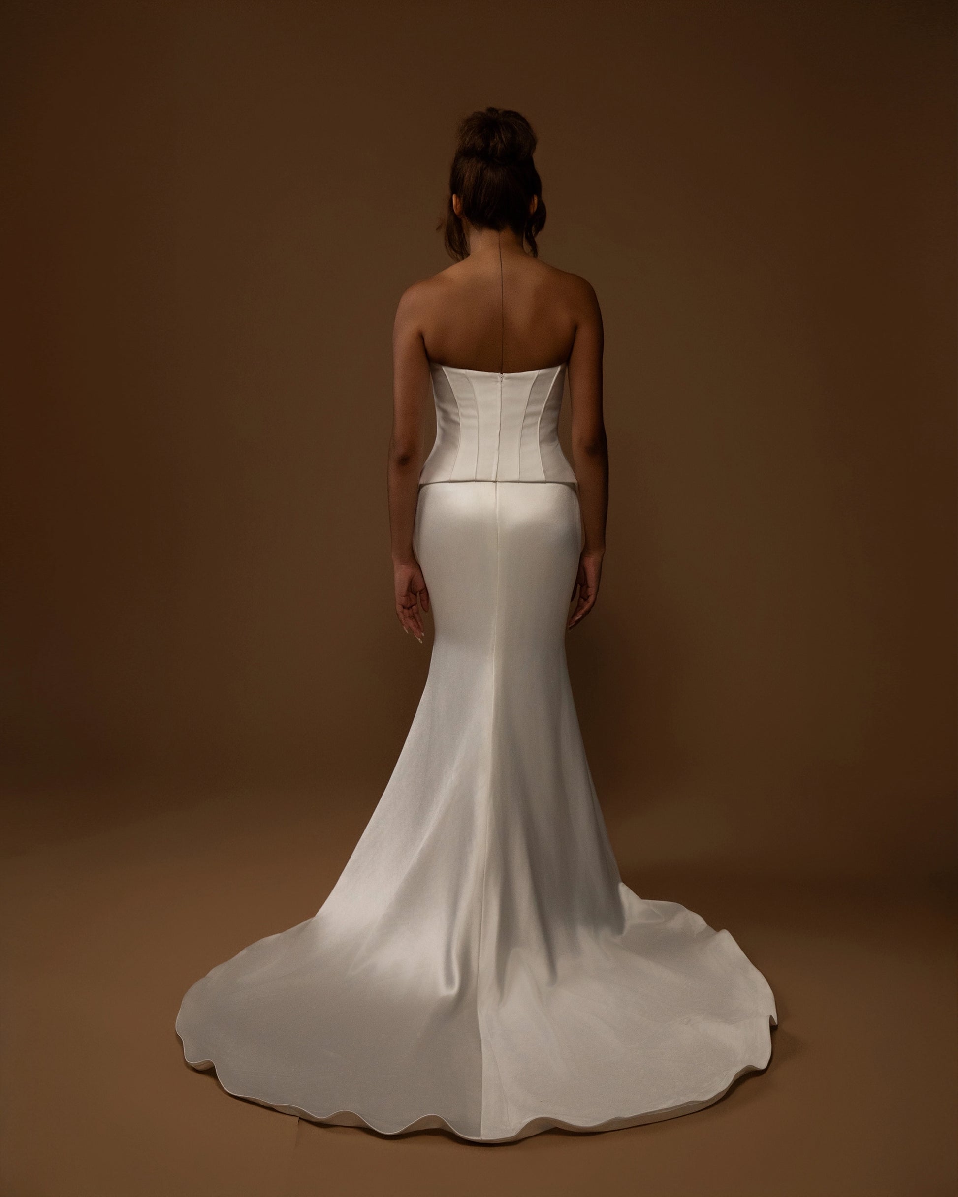 The Evangeline skirt is made from a fluid satin that hugs the hips before flaring into an elegant 18-inch train. The skirt is double lined to lay smoothly and reduce sheerness.