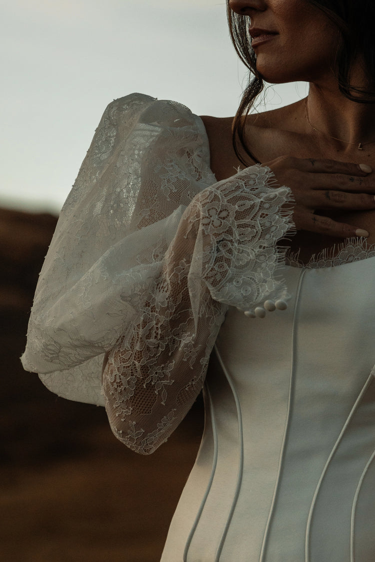 The Evangeline sleeves are an optional bold statement piece for the bride who wants a little more drama to an otherwise minimalist silhouette.